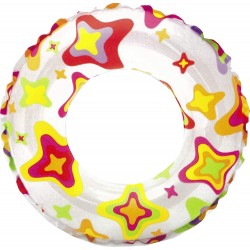Salvagente diametro 51 cm, realizzato in materiale trasparente con parte superiore stampato con 3 diverse fantasie colorate, stelle marine, pesci e cerchi, età anni 3-6. Prodotto assortito, non è possibile scegliere il colore/modello desiderato, scelta casuale
